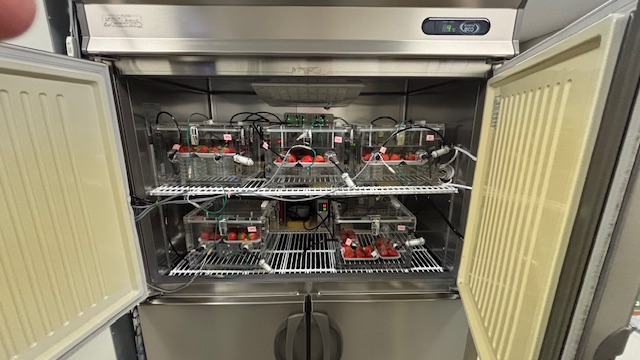 保存をメインとしている研究室の必須アイテムです。最大で8つの異なる温度環境下で同時に同じサンプルの保存性を評価する設備です。インキュベータの中には、青果物を保存するための2L容小型アクリルデシケータを並べます。当研究室では、このデシケータを50個程度保有し、様々な環境での保存試験を実施できる体制を整えています。