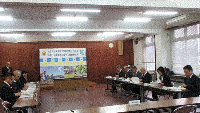 12月25日、農学部は指宿庁舎北側別館において、指宿市との教育・研究連携に関する協定の締結式を挙行しました。この協定は、指宿市と本学農学部が包括的な連携の下、それぞれが有する資源、人材などを活用することにより、指宿市内における地域活性化、人材育成および地域社会の振興に寄与することを目的としています。締結式には、鹿児島大学6名、指宿市6名の計12名が出席しました。山本 雅史農学部長、打越 明司指宿市長による協定書への署名を行い、協定の締結が正式に成立しました。