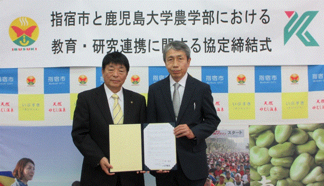 ▲協定書を手にする打越指宿市長(左)と山本農学部長(右)