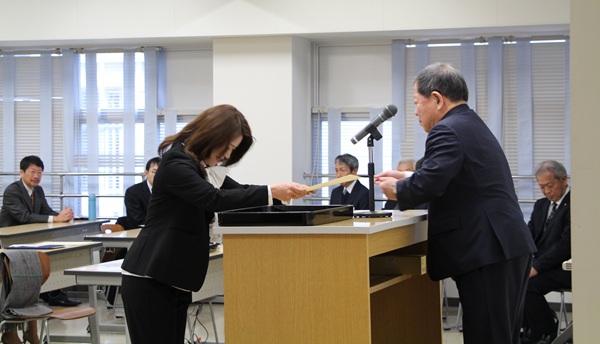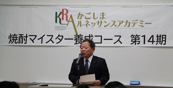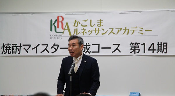 続いて本コースの運営に対し、ご支援いただいた鹿児島県酒造組合の本坊副会長から「鹿児島本格焼酎の奥深さを世界中に伝えていただき、それぞれの立場で活躍していただきたい」と、同じくご支援いただいたNPO法人日本酒サービス研究会の板場正義常務理事からは「焼酎マイスターとしての道のりを、ゆっくり着実に進んでいただきたい」と、また、かごしま焼酎マイスターズクラブの鮫島吉廣理事長から「修了した先輩方との横のつながりを強化し刺激を受け、いろいろな事業に役立てていただきたい」とそれぞれ激励の言葉として贈られました。