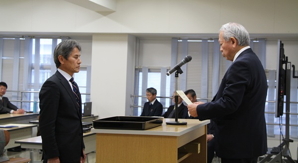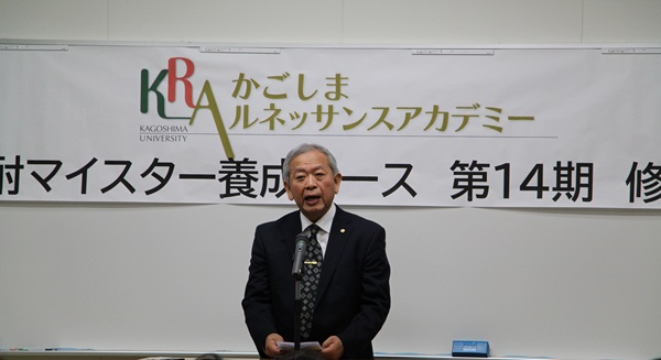 宮本篤鹿児島大学 企画・社会連携担当理事から履修を証明する履修証明書が、鹿児島県酒造組合・本坊愛一郎副会長から酒造組合が認定する焼酎マイスター認定証が、修了者代表14名に手渡されました。宮本理事から挨拶の中で、「修了された皆様方が焼酎文化を次世代へつなぐリーダーとして地域社会で存分に活躍されることを祈念いたします」とお祝いの言葉が贈られました。