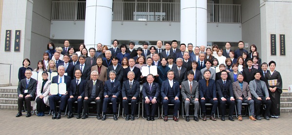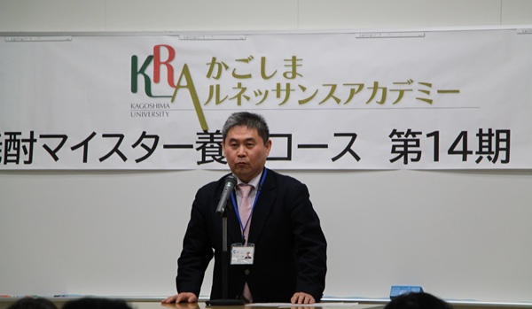 そして、修了者代表、石井大蔵氏から、本コースの運営に関わる方々へのお礼と感想、要望、今後の抱負が述べられた後、山本雅史農学部長より、特に優秀と認められた6名の修了者に表彰状と副賞が手渡され、また、祝辞が述べられました。今期も、対面とオンラインのハイブリッド受講で、鹿児島県外から21名、海外(台湾、イタリア)から5名が修了し、幅広い視点で、焼酎文化と魅力を広く発信出来る人材が誕生したと考えております。